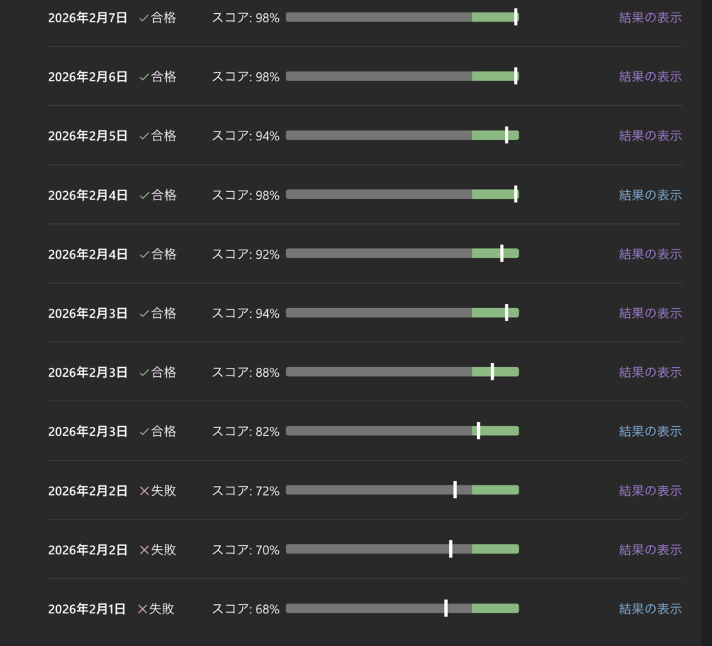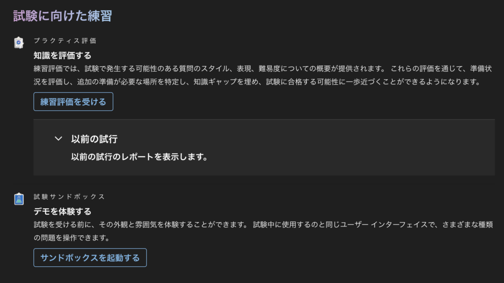 全セクション終了後は、⬇️のプラクティス評価をひたすら周回します。(ちなみに、試験サンドボックスは受けても受けなくてもどっちでもいいです。スコアには影響しません。)